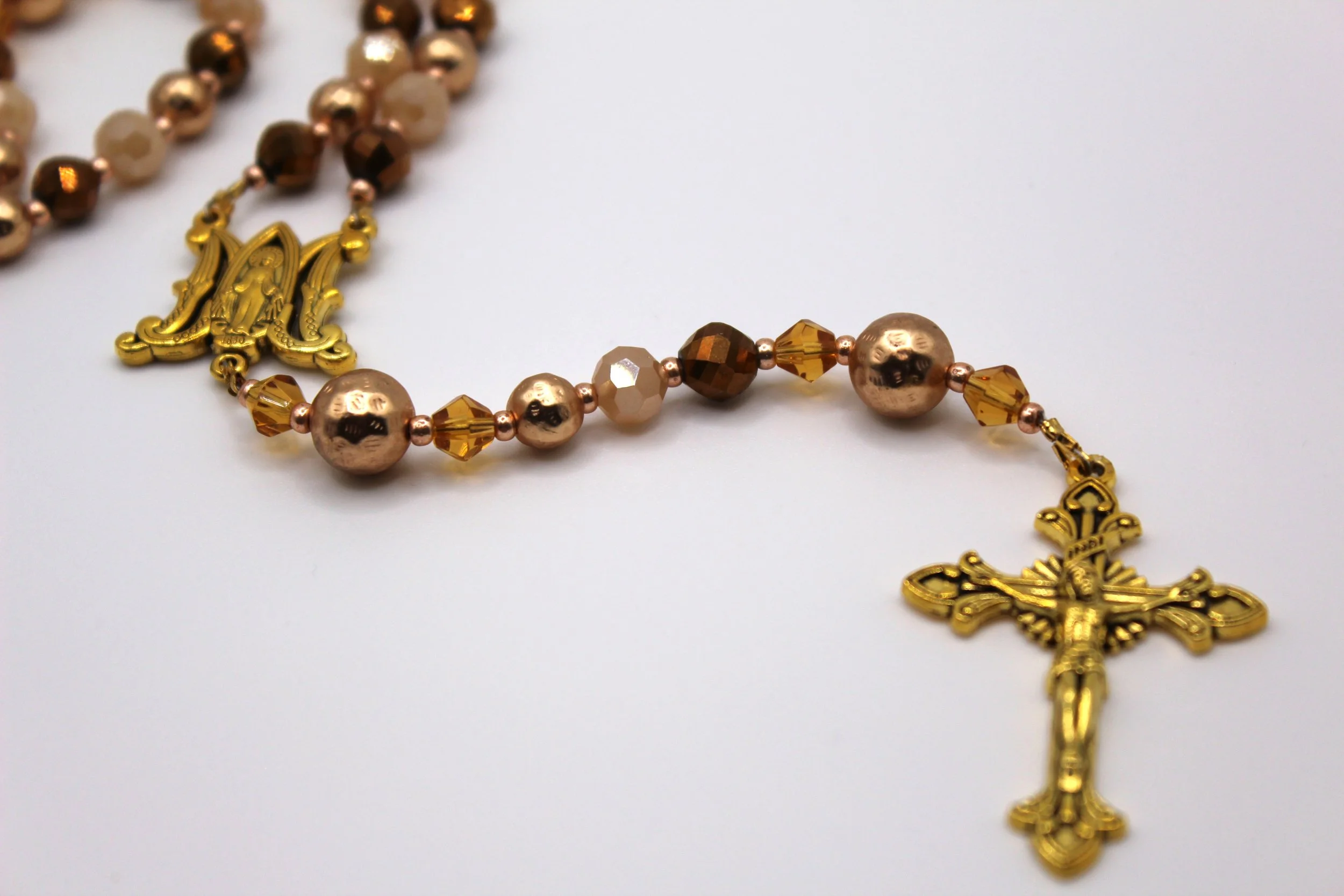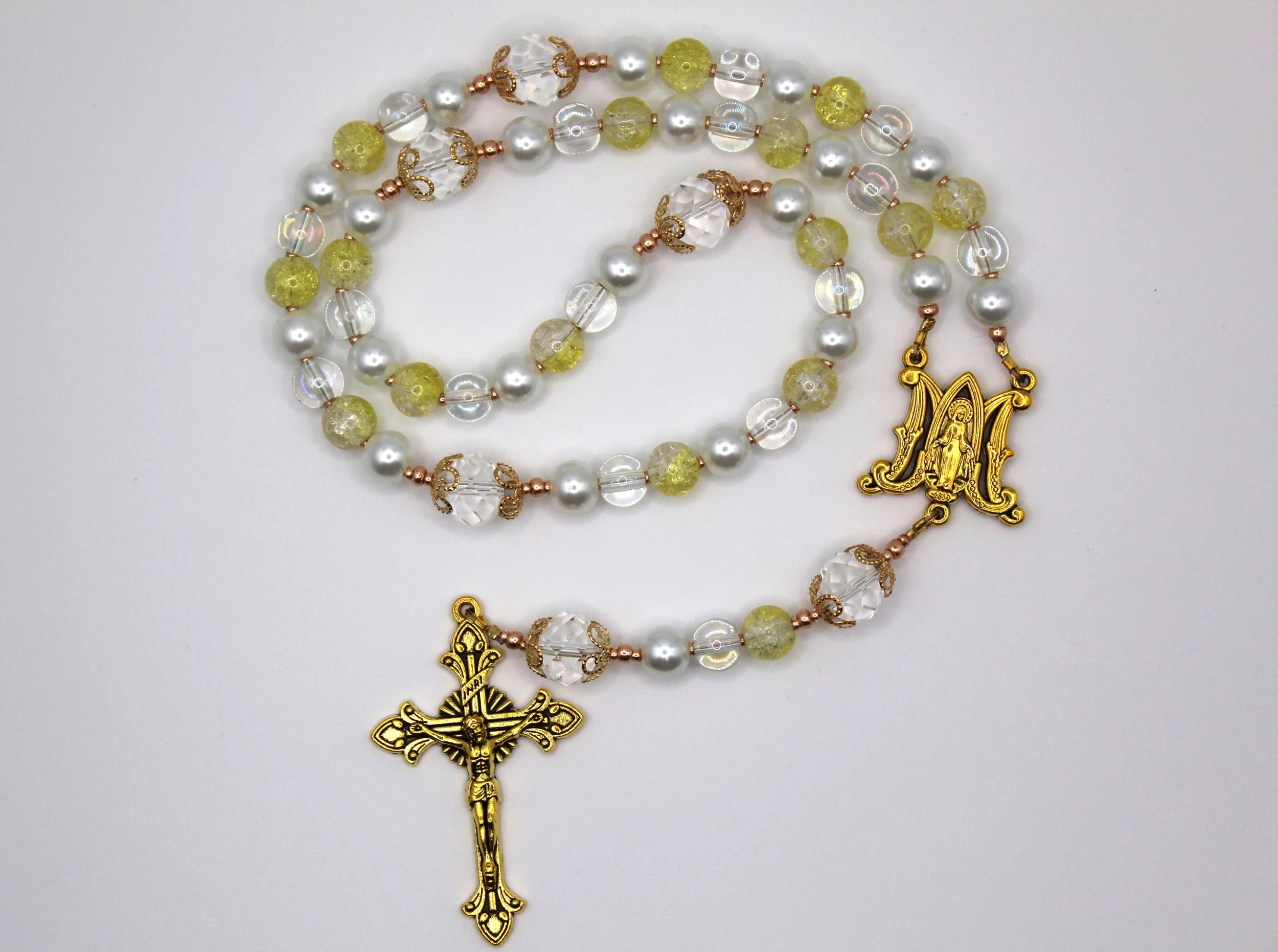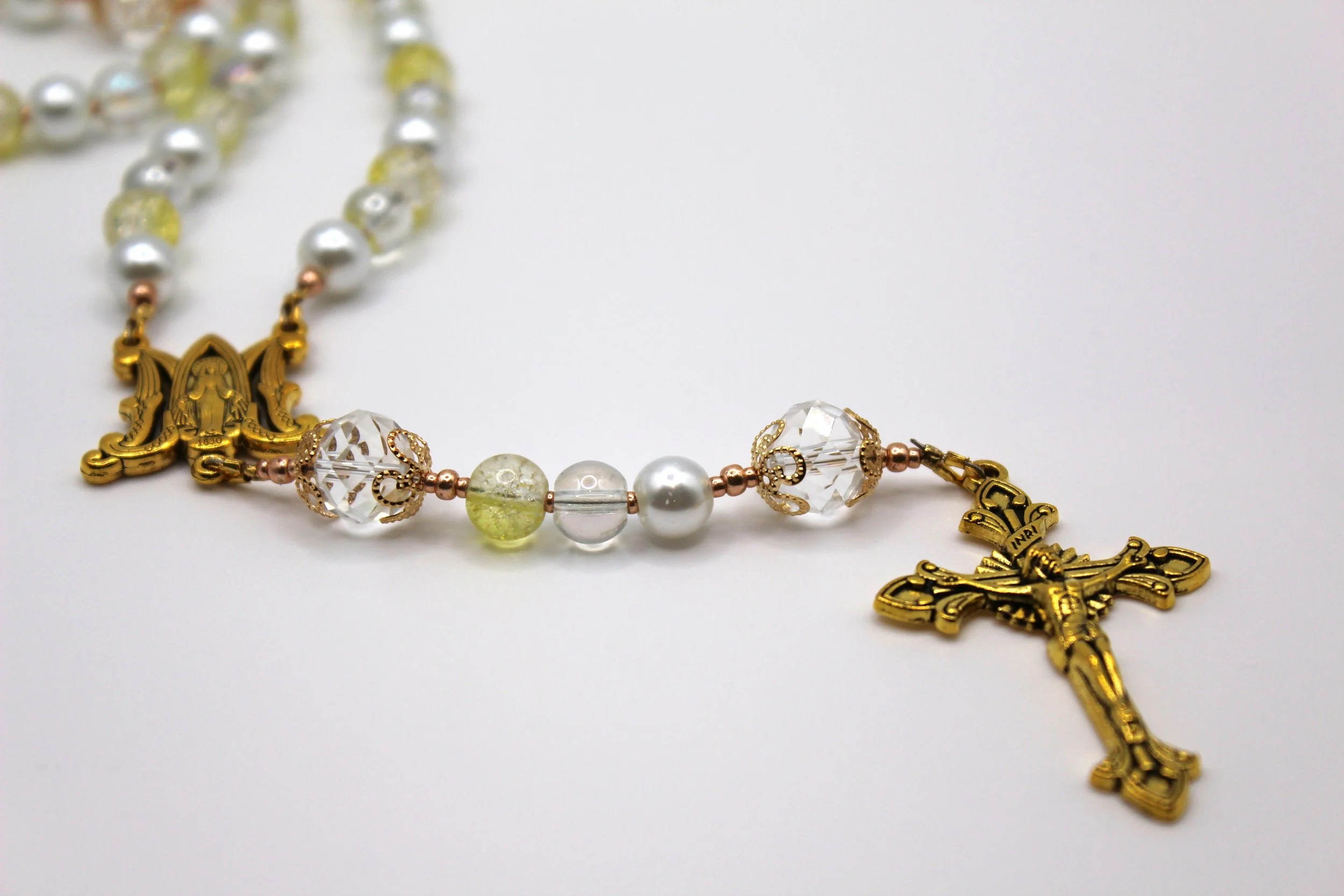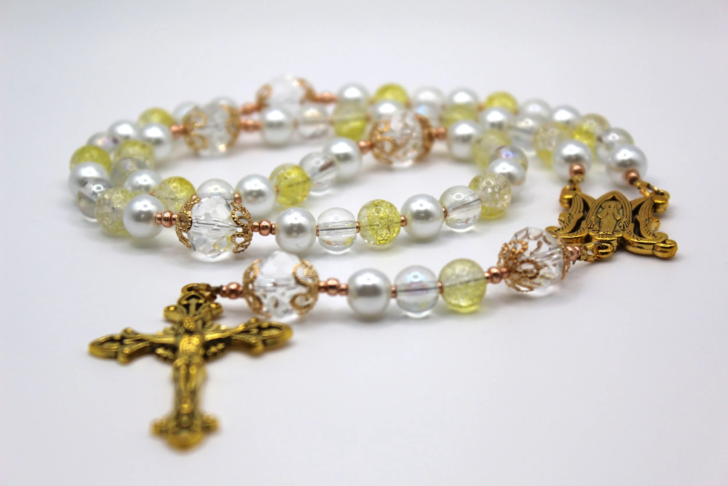 This handmade rosary combines dazzling yellow, reflective crystal, and white pearl inspired by the vision of Our Lady of Fatima. She wore a white mantle bordered with a thin thread of gold that looked like a ray of sunlight. She radiated a light clearer and more intense than a crystal glass filled with sparkling water when the rays of the burning sun shine through it. The “Our Father” beads are capped with crowns meant to represent the crown often seen on images of Our Lady of Fatima.