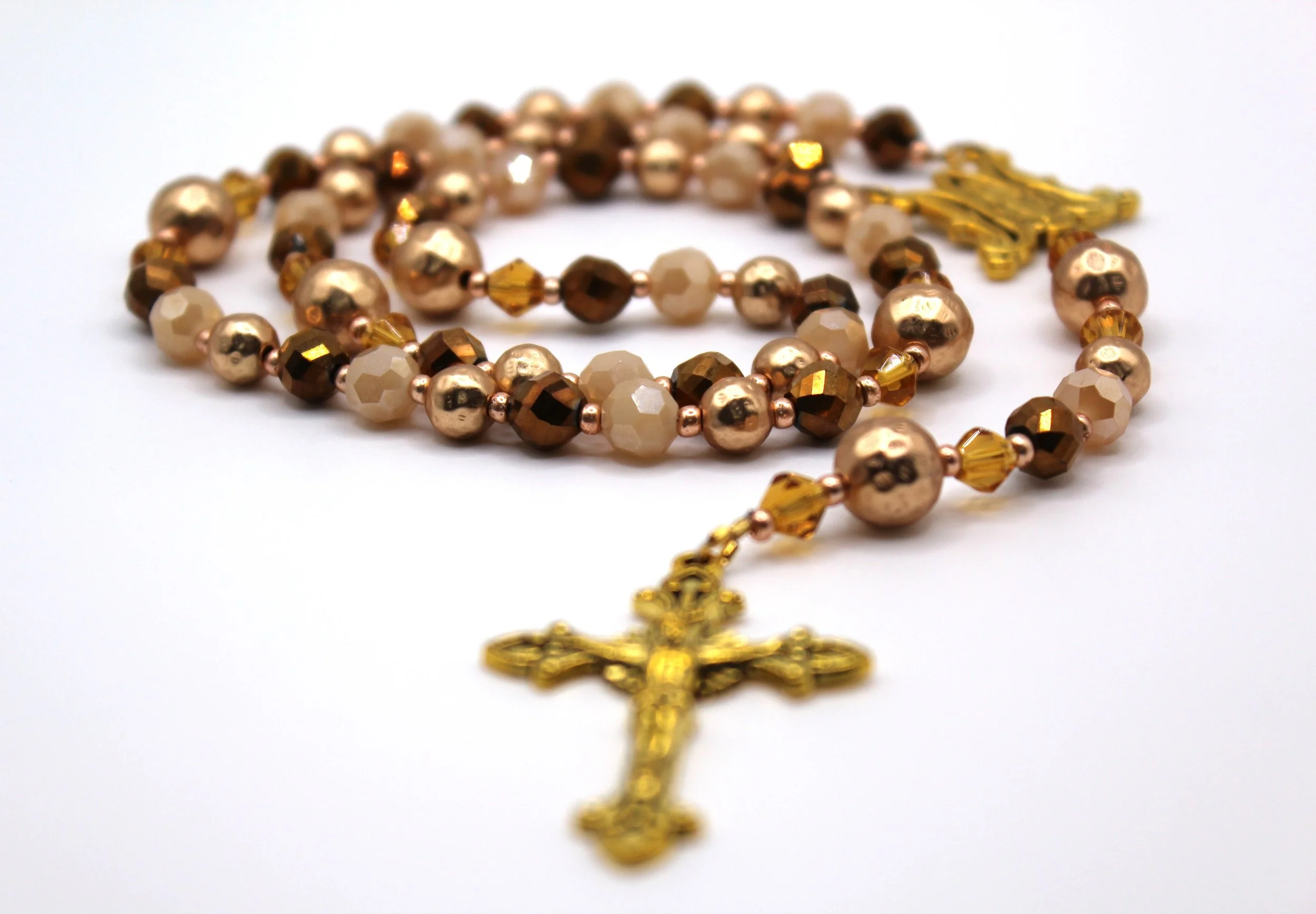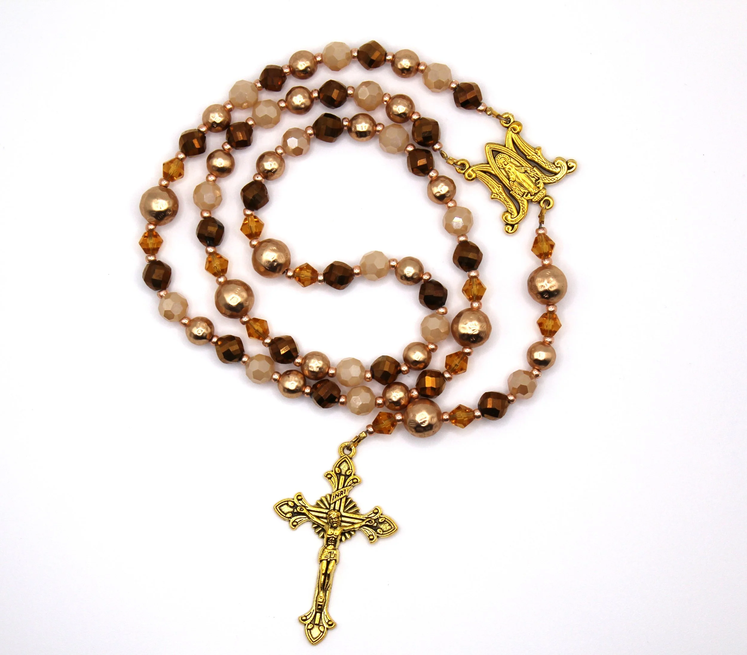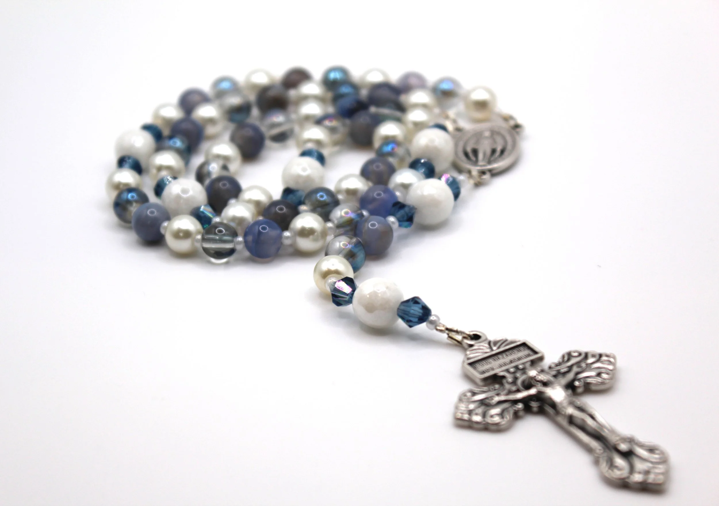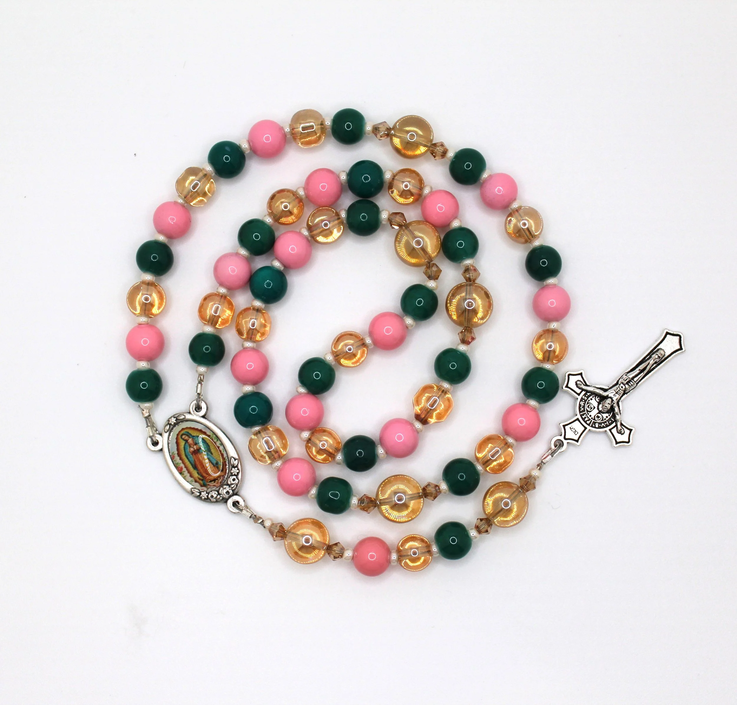 This handmade rosary combines dazzling yellow, reflective crystal, and white pearl inspired by the vision of Our Lady of Fatima. She wore a white mantle bordered with a thin thread of gold that looked like a ray of sunlight. She radiated a light clearer and more intense than a crystal glass filled with sparkling water when the rays of the burning sun shine through it. The “Our Father” beads are capped with crowns meant to represent the crown often seen on images of Our Lady of Fatima.