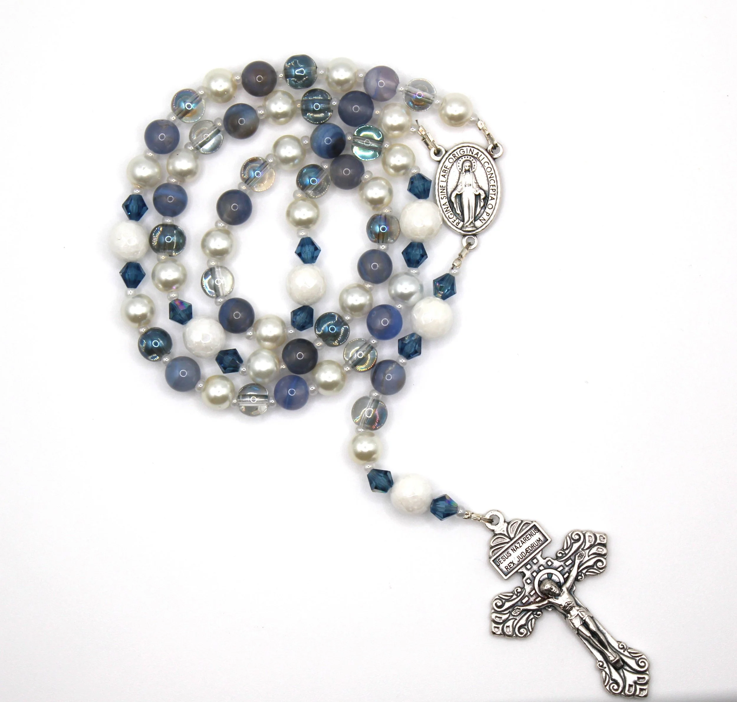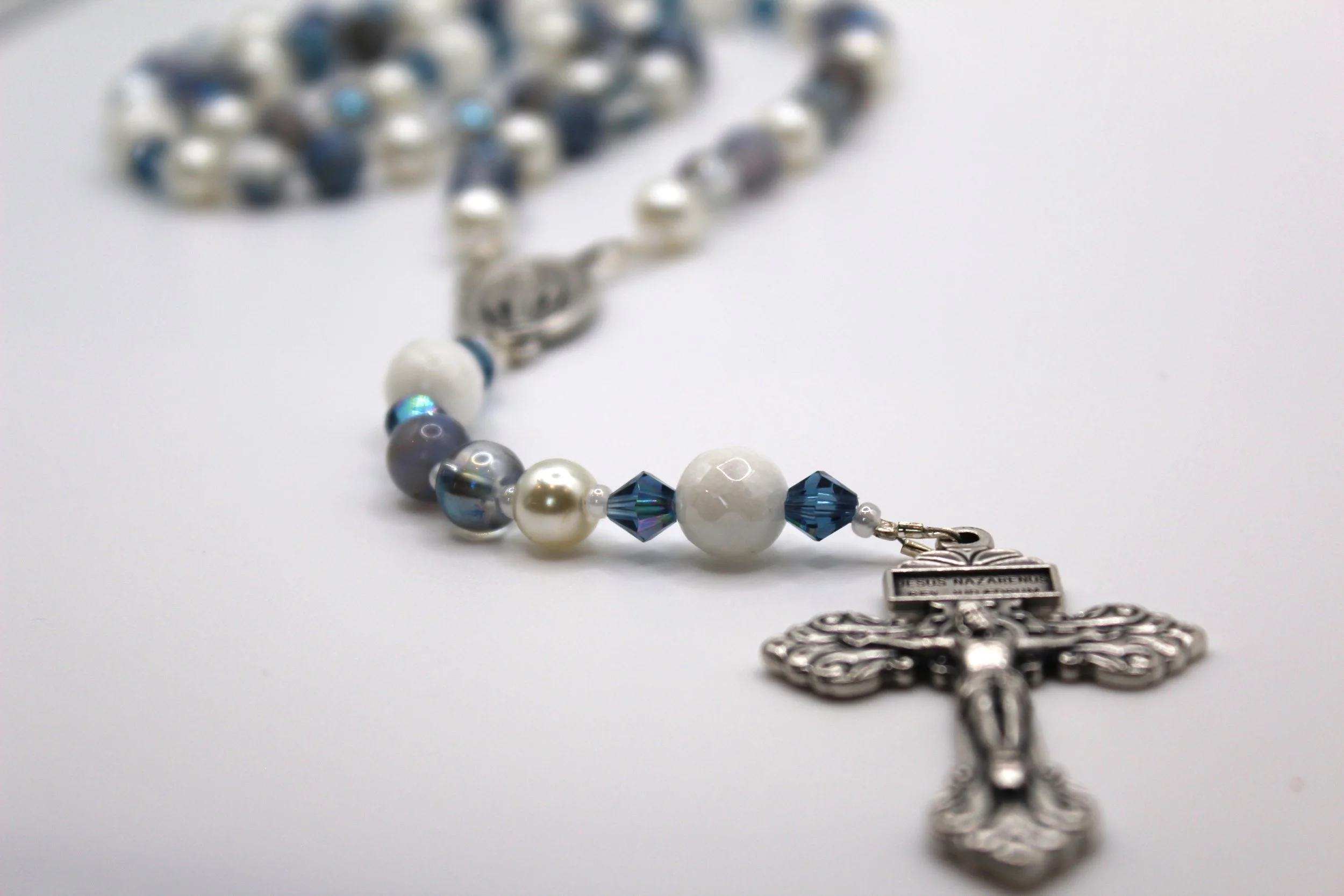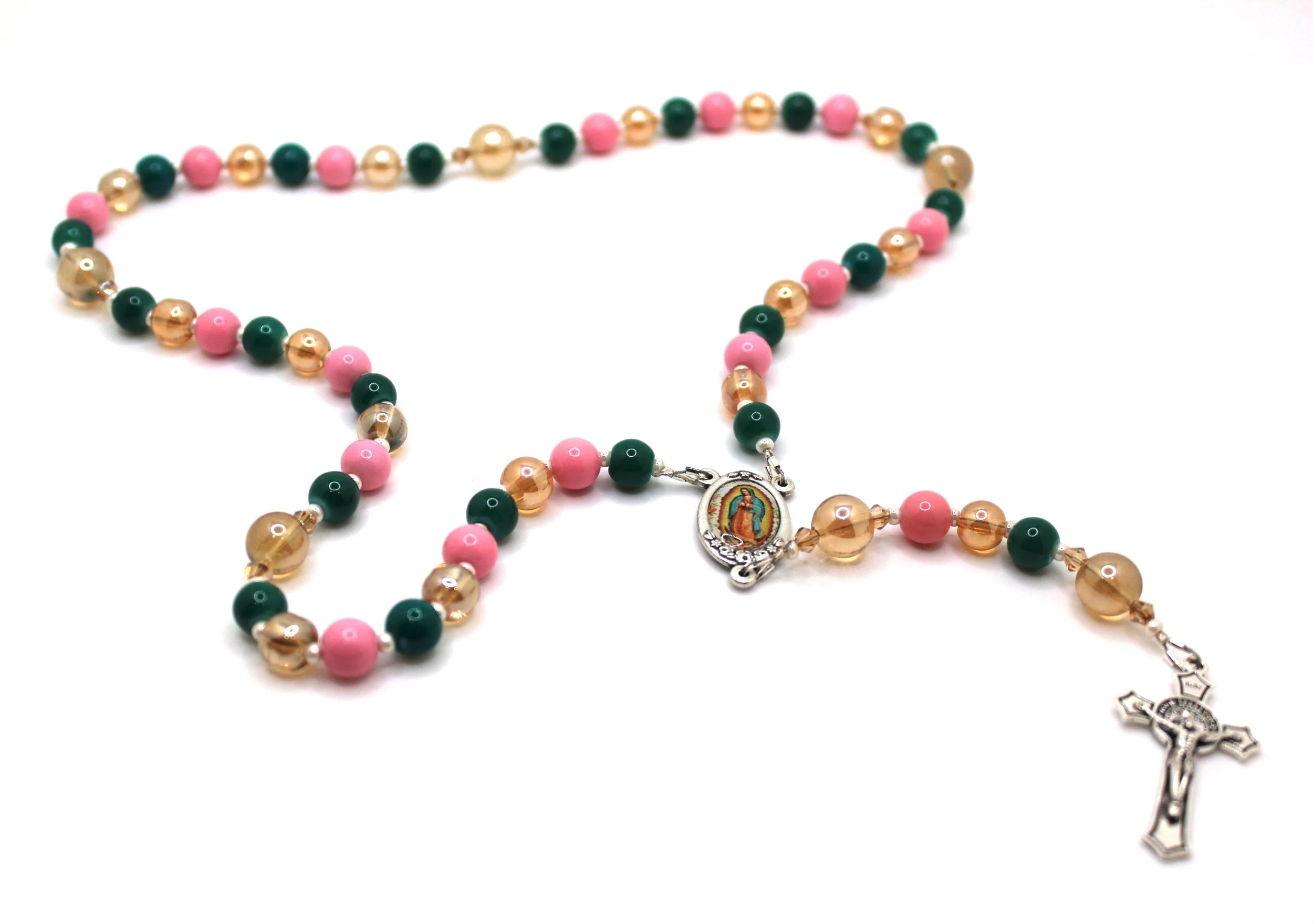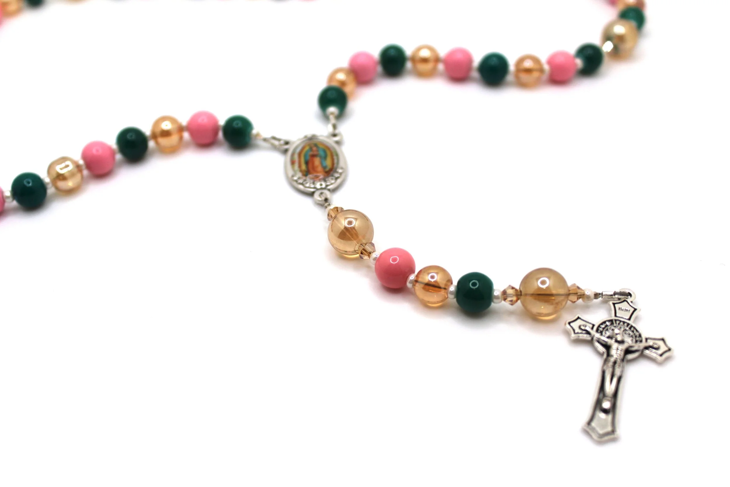 This handmade rosary combines dazzling yellow, reflective crystal, and white pearl inspired by the vision of Our Lady of Fatima. She wore a white mantle bordered with a thin thread of gold that looked like a ray of sunlight. She radiated a light clearer and more intense than a crystal glass filled with sparkling water when the rays of the burning sun shine through it. The “Our Father” beads are capped with crowns meant to represent the crown often seen on images of Our Lady of Fatima.