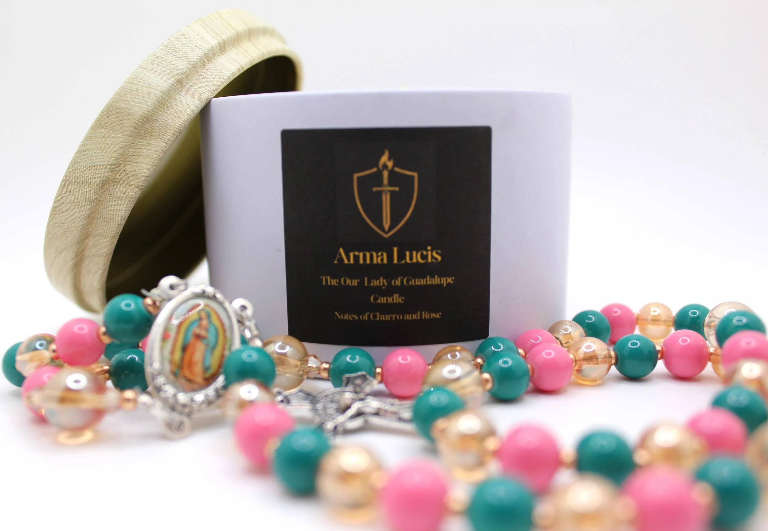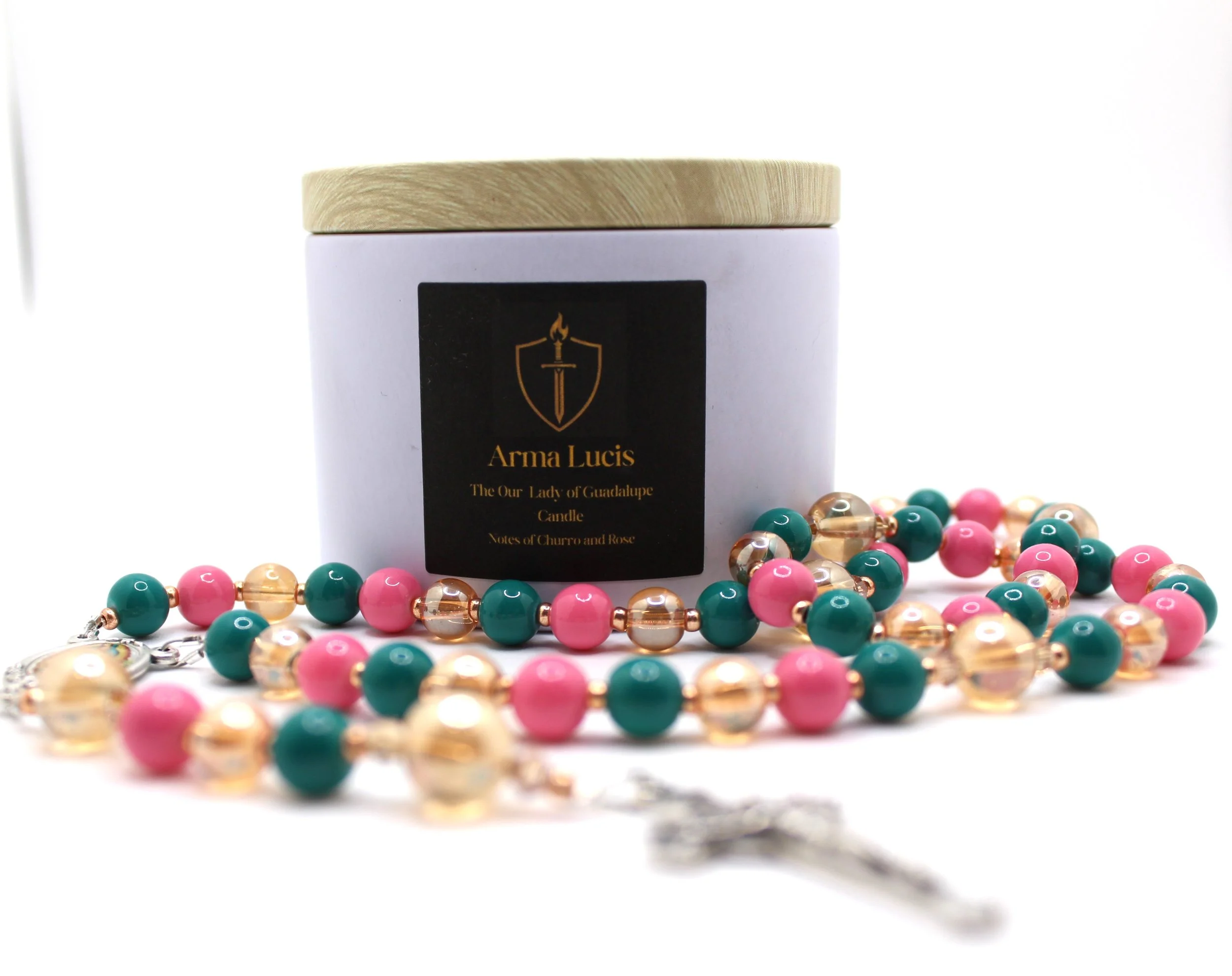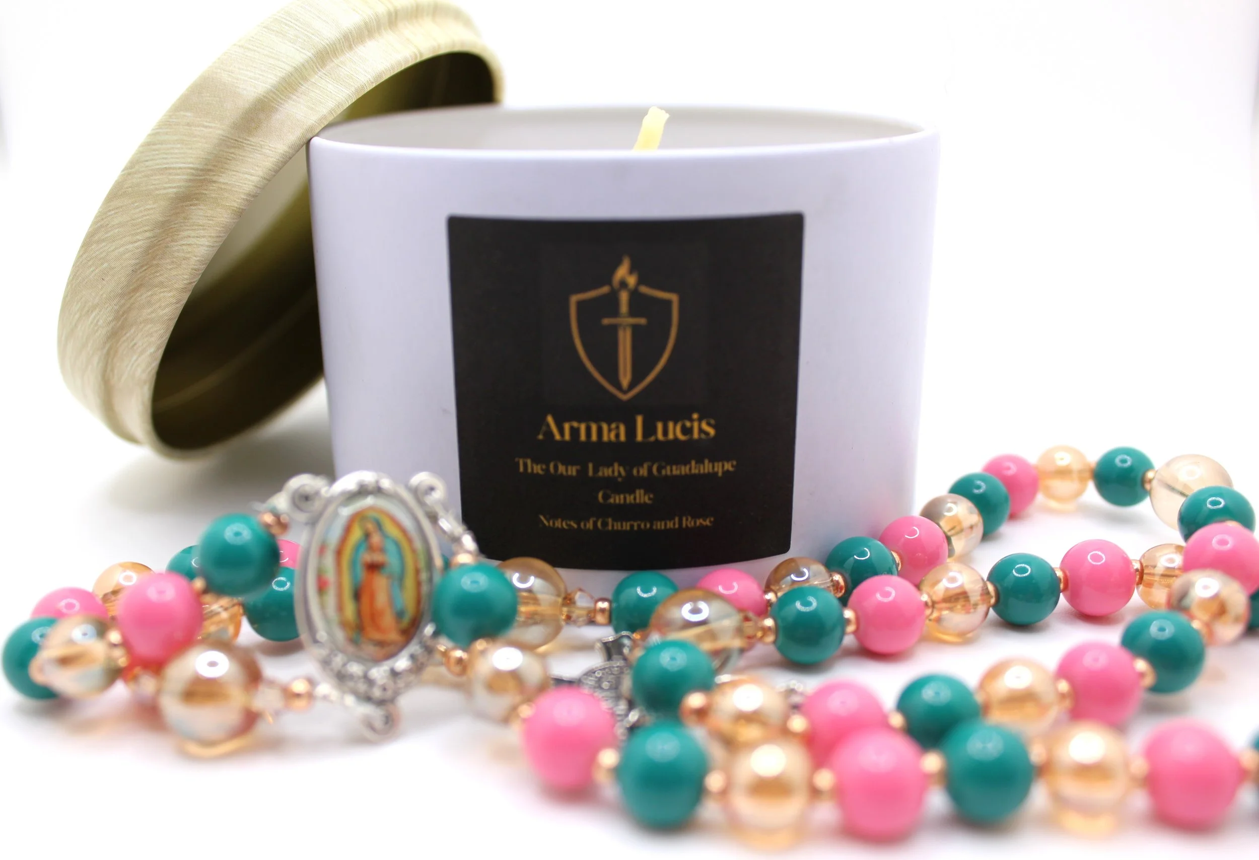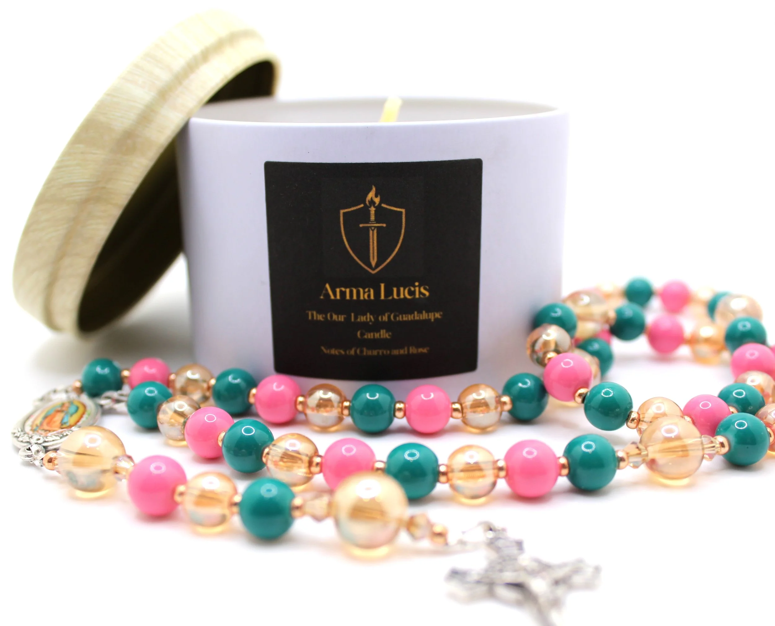 Celebrate the month of the Holy Rosary with the second rosary and candle duo of the collection! The duo includes an Our Lady of Fatima candle from Arma Lucis Candles. This 100% Beeswax candle features notes of lavender and lemon in honor of Our Lady of Fatima. Light it while you pray the Fatima rosary for a tranquil pray experience.