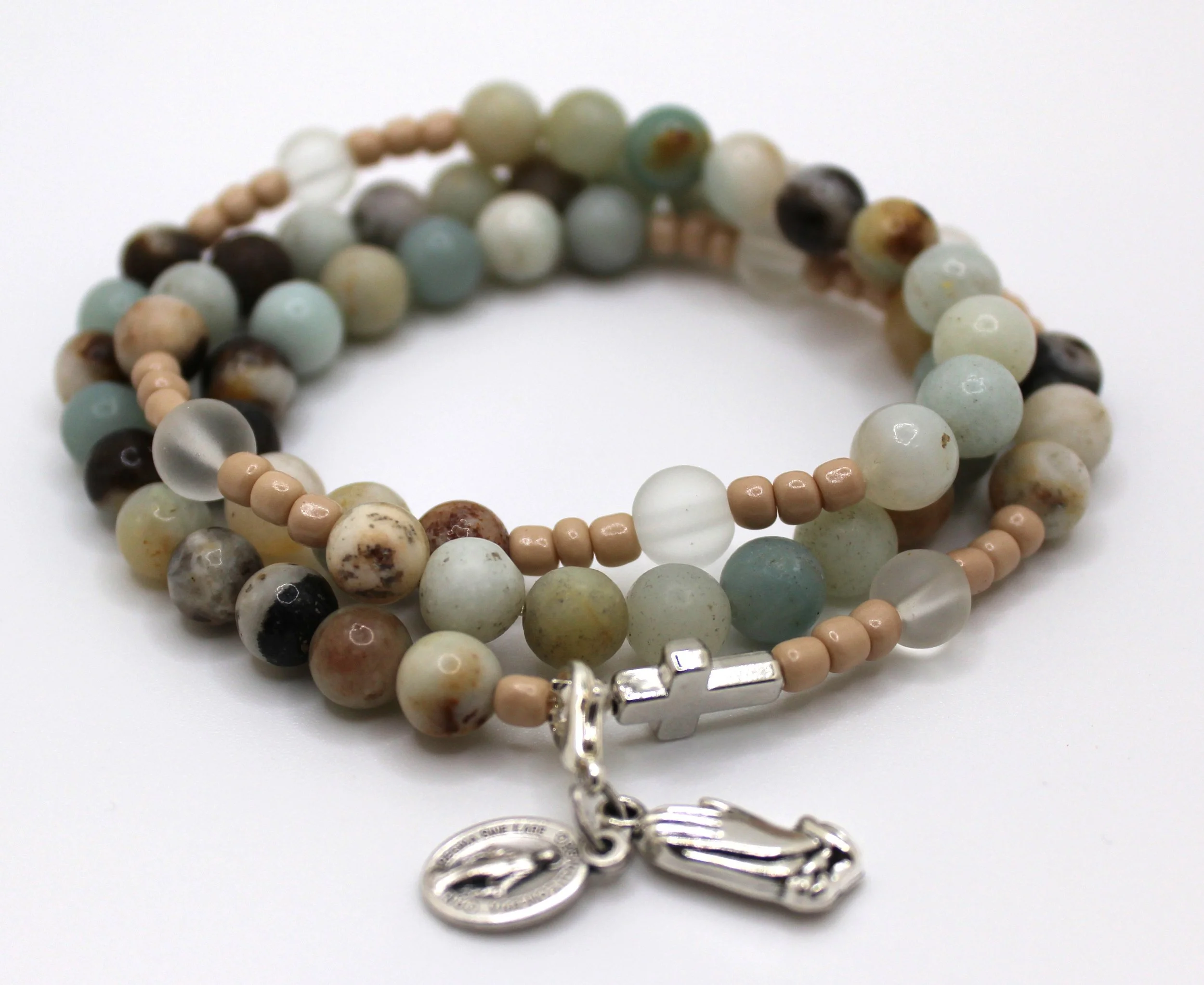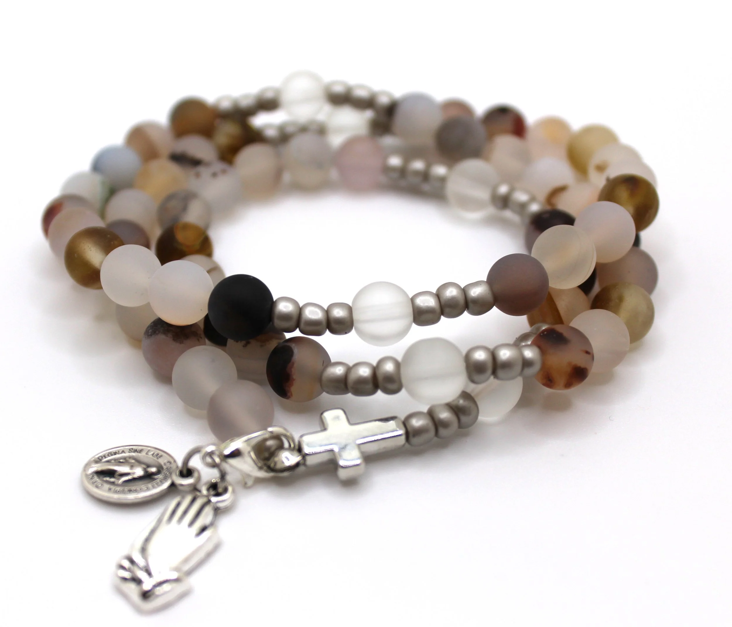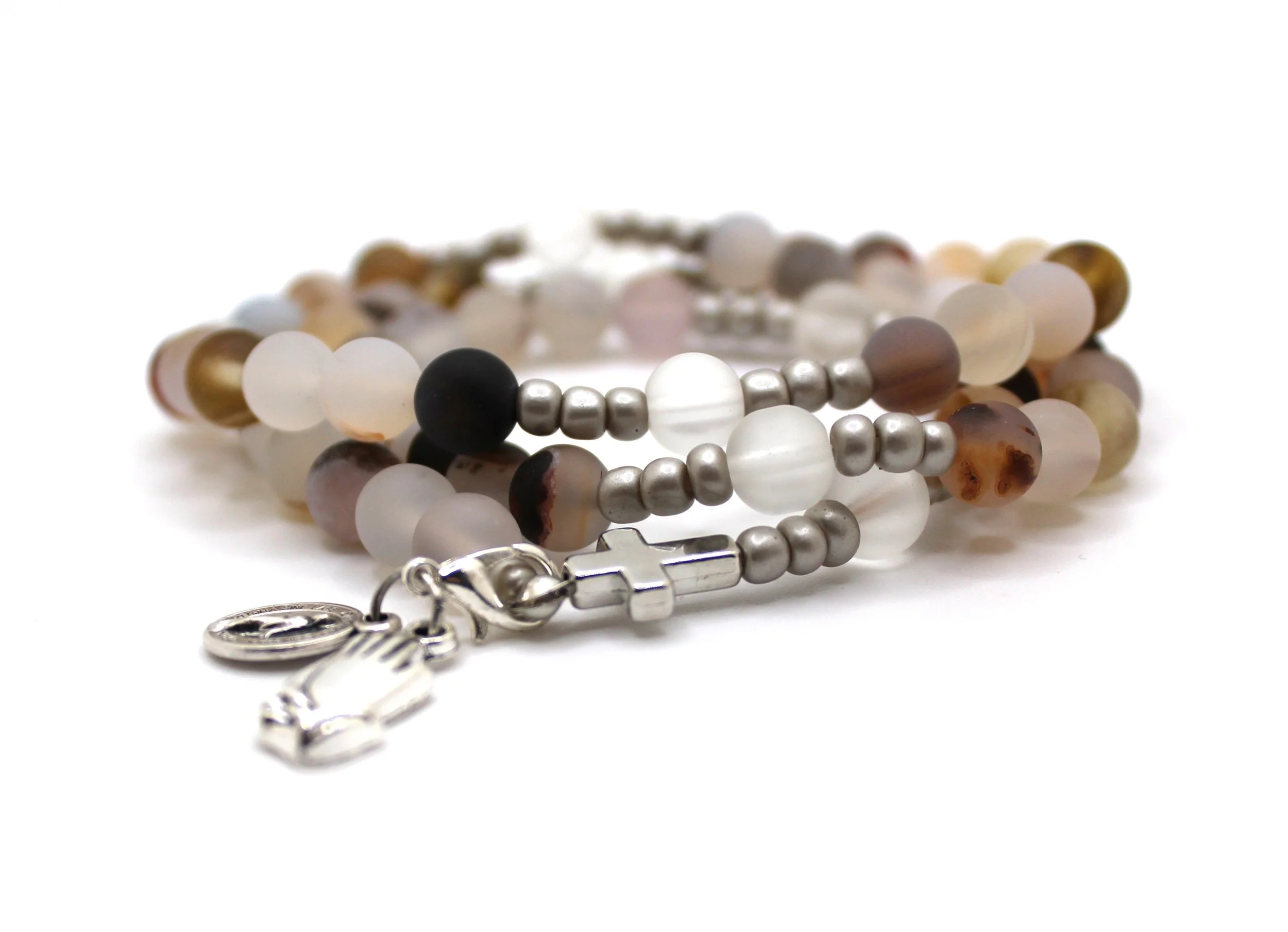 This handmade rosary bracelet features marbled violet glass beads with a natural stone look to create a full five-decade rosary, complete with beads for the introductory prayers. Includes a moveable miraculous medal and cross charm to keep your place as you pray throughout the day.
