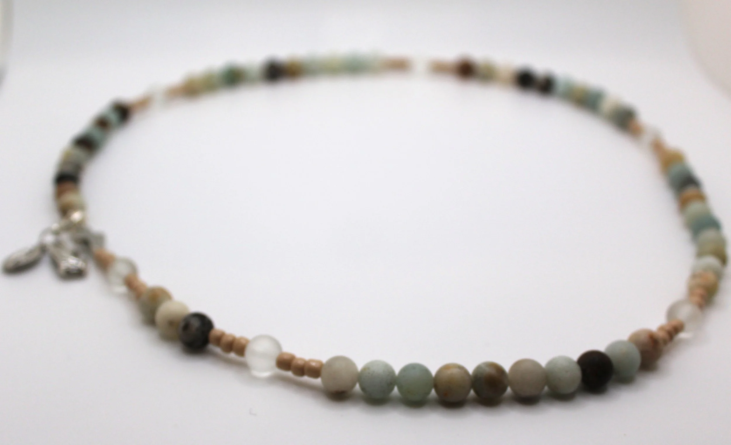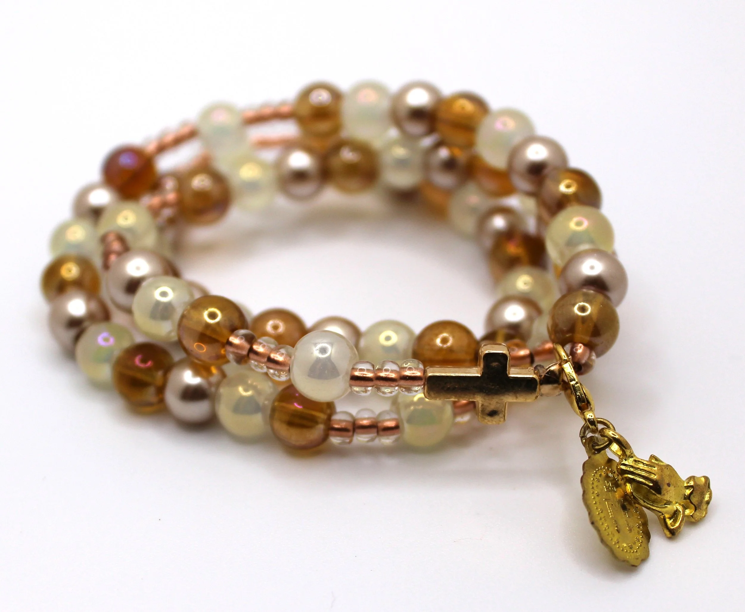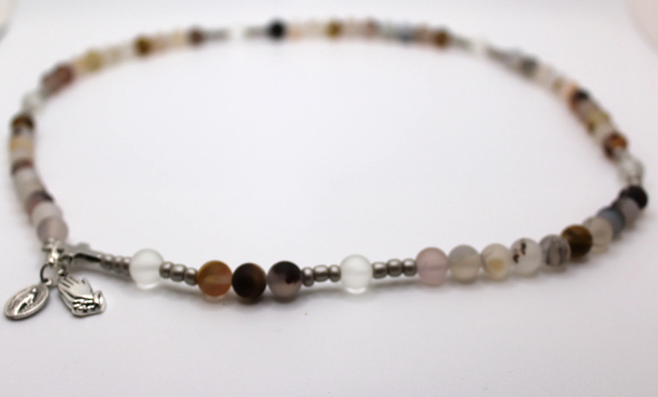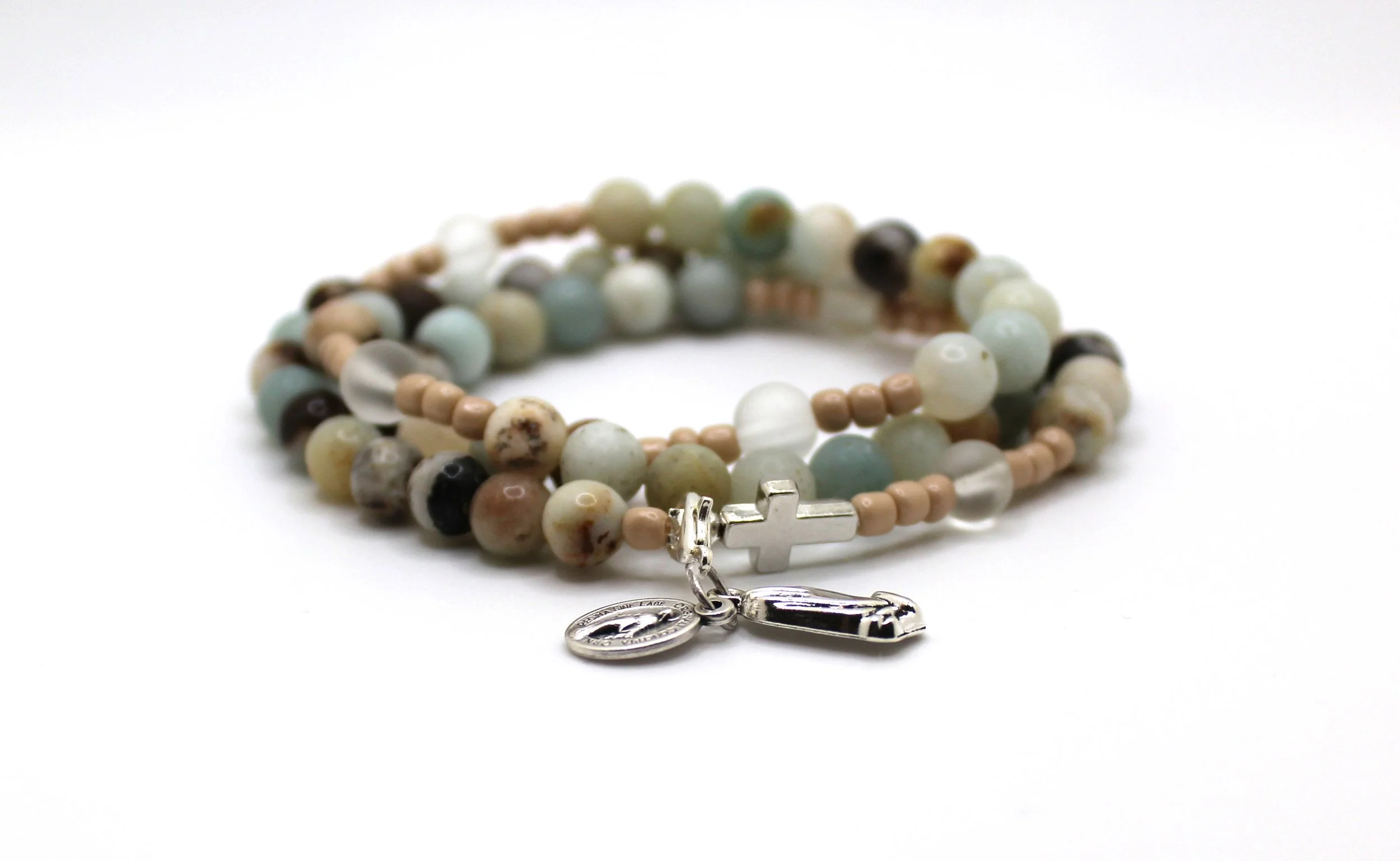 This handmade rosary bracelet features marbled violet glass beads with a natural stone look to create a full five-decade rosary, complete with beads for the introductory prayers. Includes a moveable miraculous medal and cross charm to keep your place as you pray throughout the day.